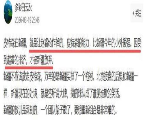 有意思的是,赵睿昔日是皮特森的队友,如今成为皮特森的对手。但是昨晚赵睿遭到皮特森羞辱,他投中一记三分都好像在说:赵睿你还嫌我独吗?还嫌我出手不合理吗?但讲真的,昨晚皮特森真是羞辱和打爆了昔日炮轰他的赵睿。
