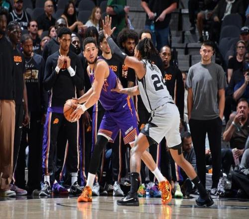 马刺过去3场连赢黄蜂、快船与国王收获3连胜,太阳过去3场连输猛龙、凯尔特人与森林狼遭遇3连败,本赛季前三次交锋马刺1胜2负处于下风。本场马刺缺少加西亚与卡斯尔,太阳缺少奥尼尔、阿伦、狄龙与马威。首节开局马刺率先取得10-5领先,尚帕尼三分开火扩大13-7领先,马刺持续压制维持21-15领先。格林接连得分引领一波11-3攻势反超比分,首节结束马刺24-26落后太阳。首节太阳22中11,其中三分6中4,格林5中4得到9分与布克5中1仅得到2分2失误;马刺24中10,其中三分8中2,文班亚马2中2得到6分3篮板1抢断。
